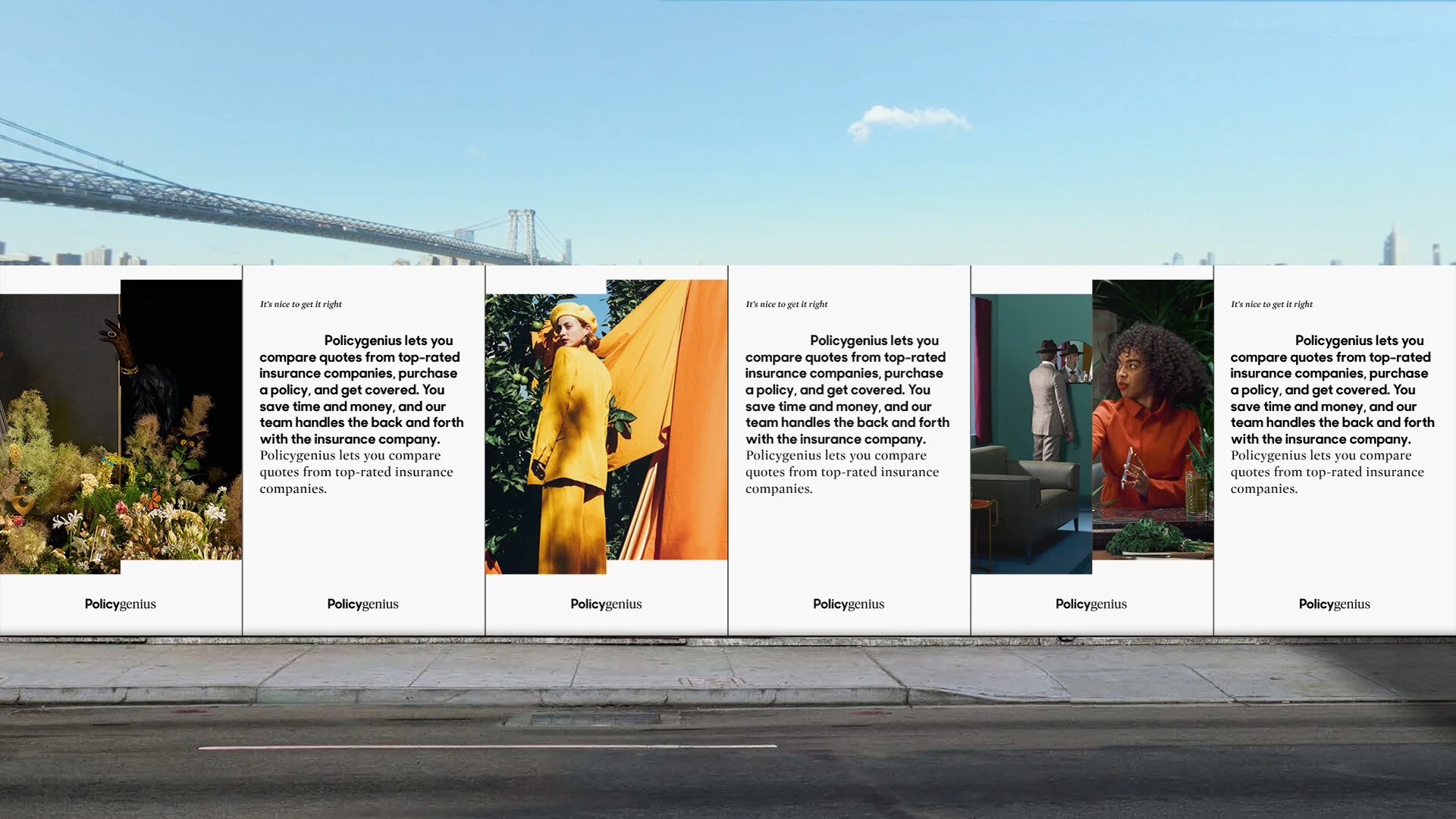 Policygenius wanted a rebrand their internal team can easily implement, and is externally easily recognized. My task was to give the brand a scalable visual device that non-brand designers could easily replicate both in physical and digital spaces. It needed to feel modern and approachable to stand out from the coldness and corporate feeling of the insurance and fintech industries. With their growth, Policygenius’ audience shifted toward a more premium audience that still needed to speak to the masses. My solution was to strip back the brand to its logo and build an incremental design system that ladders up to the brand strategy: “it’s nice to get it right.”
